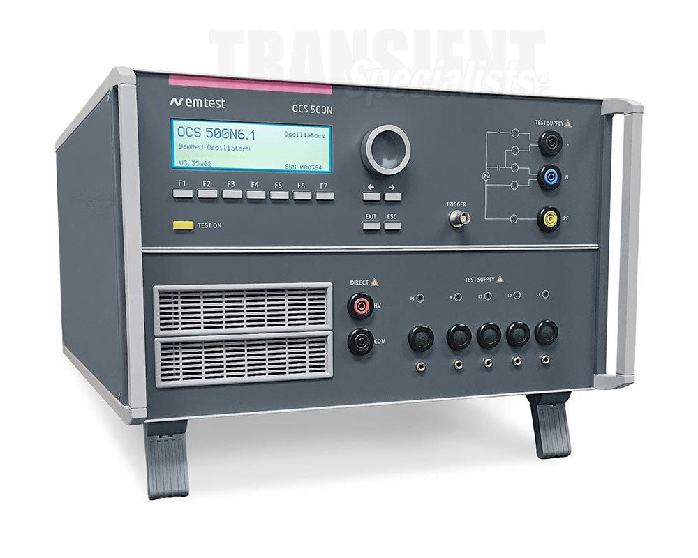 The OCS 500N6 includes test capabilities for ringwave up to 6kV (as per EN/IEC 61000-4-12) and the damped oscillatory waves at 100 kHz and 1 MHz up to 3 kV (as per EN/IEC 61000-4-18).