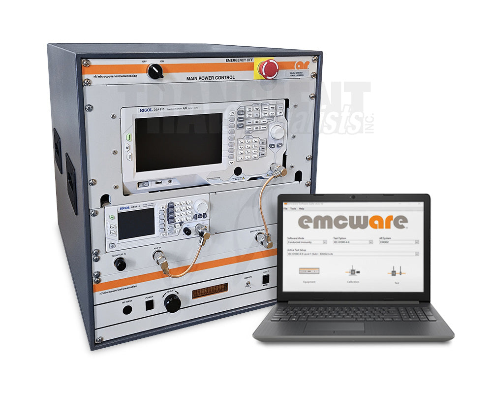 The Model CI00402 is a fully self-contained state of the art system designed to test RF Conducted Immunity. The system contains a signal generator, spectrum analyzer, 100W nominal AR amplifier, a 10 kHz to 400MHz directional coupler and emcware® control software. Everything is contained in a single housing, which eliminates setup issues. This system provides the versatility needed for every test laboratory and equipment manufacturer. The RF amplifier, signal generator and spectrum analyzer can be used independently of the system. If special needs arise or standards were to change a larger amplifier can be connected to the system. The use of spectrum analyzer and signal generator may also be controlled by software.