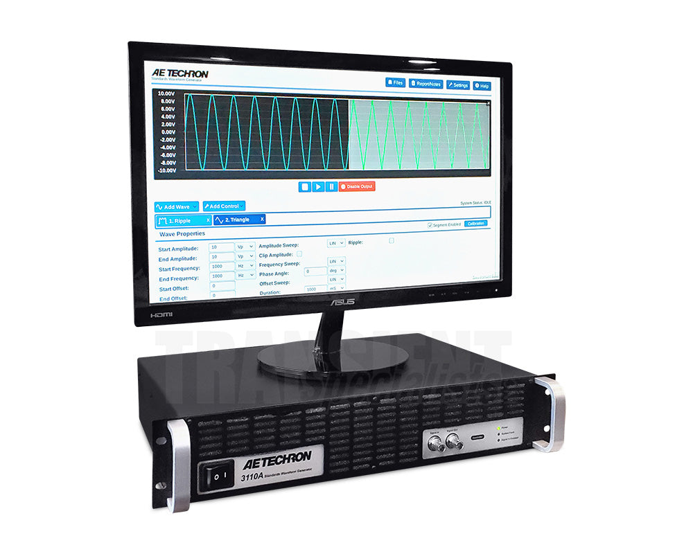 The 3110A outputs a standard analog signal that can work with any AE Techron amplifier or other LF amplifiers that you already have. It has a scalable output, so the values entered in the 3110A interface will result in your desired system output. When coupled with the AE Techron model 7228 amplifier, the 3110A can create virtually all waveforms, DC offsets, dropouts and surges needed for EMC tests with rise/ fall times of 1 μs or greater and frequencies from DC to 1 MHz.