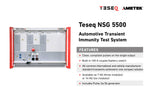 NSG 5500 modules. The NSG 5500 offers unprecedented flexibility for transient testing. Teseq has designed a solution with various transients in one modular and upgradeable chassis. The basic ISO 7637 tests for pulse 1, 2a, 3, 5, 6 and 7 and variants are integrated into the same chassis. Optional pulse 4 and pulse 2b control is available, however, use with the NSG 5600 offers several benefits over this budget solution. Additionally, when standards change, as they do every year, the NSG 5500 system may be upgraded with different modules when necessary so that your new and old modules may both be retained, either exchanged with new modules or loaded into an optional expansion chassis. Based on our exclusive technology, Teseq offers the most flexible and upgradeable system in the world to protect the users’ investment in test equipment.
